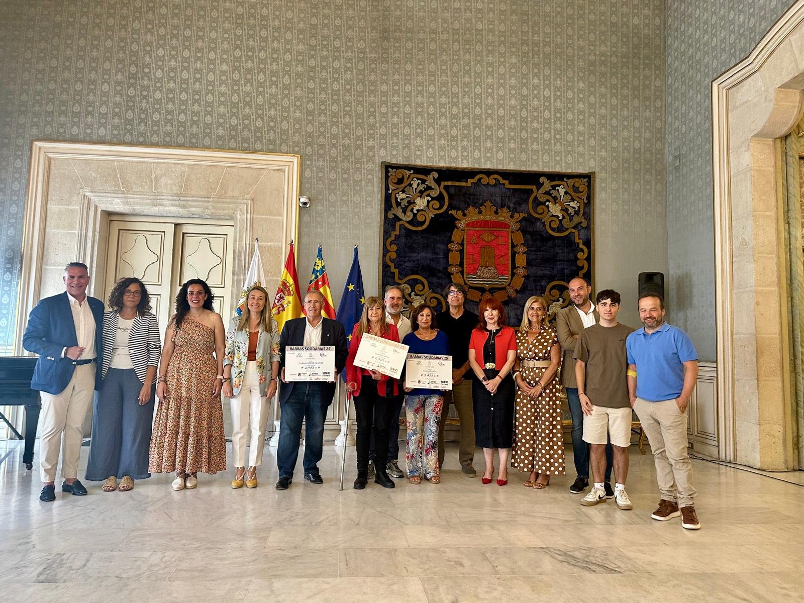 Alicante, June 6, 2025. The Alicante City Council has delivered the four checks from the proceeds of the solidarity bars installed at the New Year’s Eve 2024 and Carnival 2025 festivals to the associations Alinur, APSA, and the Jorge Talavera Foundation. The Councilwomen for Festivities, Cristina Cutanda, and Commerce, Lidia López, along with the president of the Association of Restaurants and Leisure Establishments of Alicante – Alroa, Javier Galdeano, and members of the municipal Corporation, welcomed the social entities at an event held this Friday in the Blue Hall of the Town Hall. The initiative raised a total of 7,299 euros in this edition, and each entity received a solidarity check for 2,433 euros to carry out social projects.