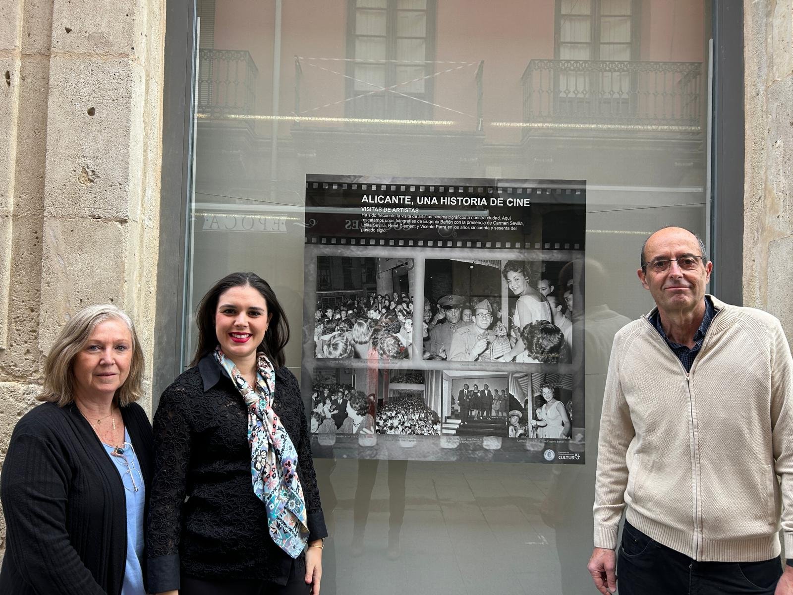 En los escaparates se muestran desde el anuncio de la primera sesión de cine en Alicante en 1896 hasta las visitas de Carmen Sevilla, acompañadas de carteles de películas como «La Máscara de Hierro» y «La llave maestra».